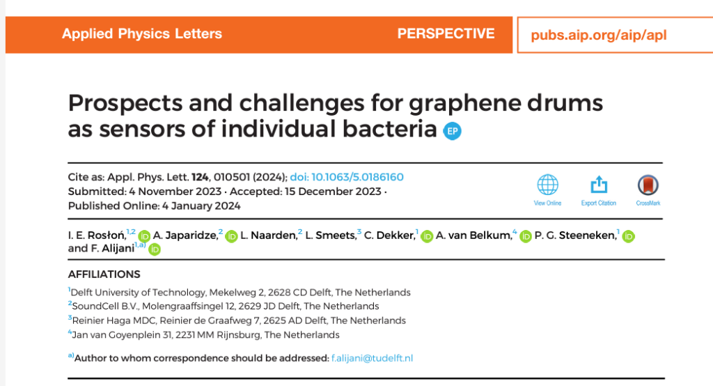 SoundCell has published its latest data in the journal of Applied Physics Letters. In this collaborative work with the Reinier Haga Medical Diagnostics Center, the authors discuss the roadmap for using graphene technology for antibiotic susceptibility testing and present most recent data on clinical isolates. Read the full paper here.